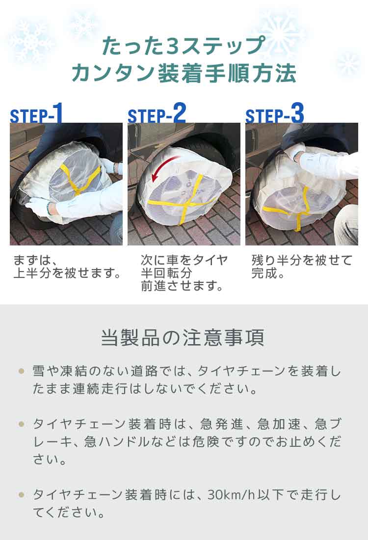 ※スノーソック装着時は時速50km以上のスピードで走行しないで下さい。