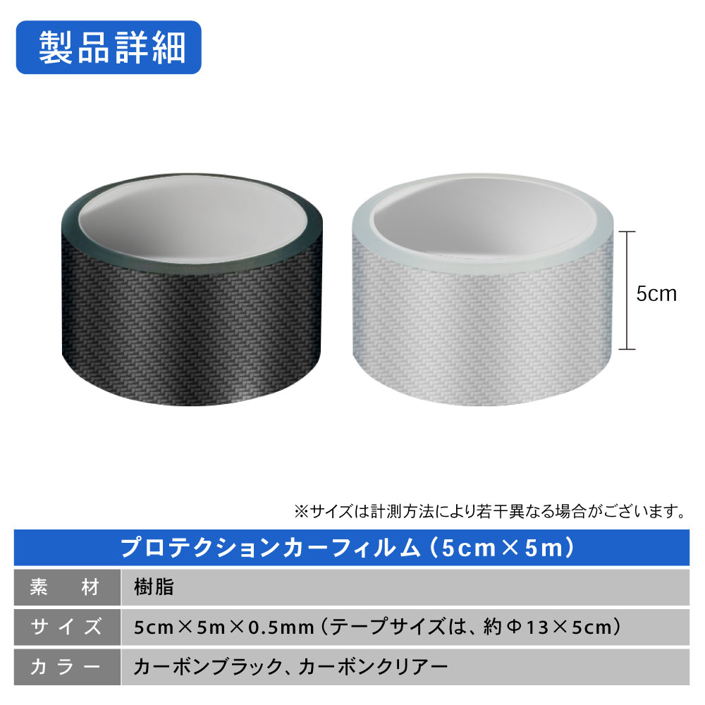 | 商品詳細 | ・商品名:プロテクションカーフィルム(5cm 5m) ・素材: 樹脂 ・サイズ:5cm 5m 0.5mm(テープサイズ:約 13 5cm) ・カラー:カーボンブラック、カーボンクリアー |