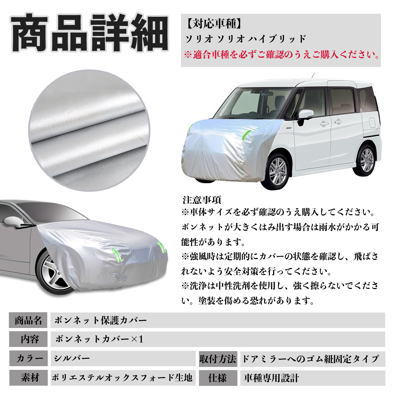 スズキ ソリオ ソリオ ハイブリッド ボンネットカバー 防炎フロント保護カバー 車カバー 劣化 日焼け防止 アンチエイジング 防塵 蛍光反射 WeCar