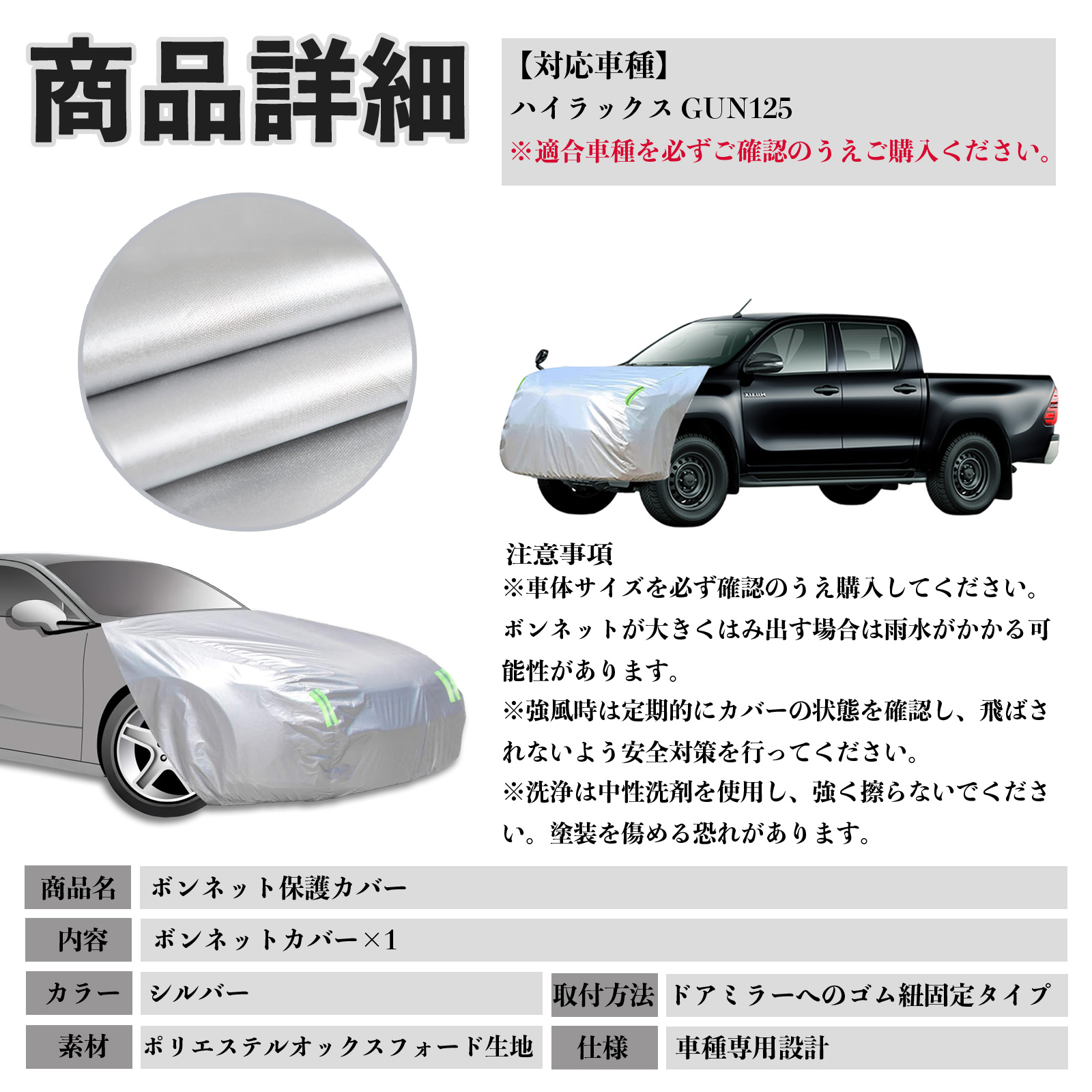 トヨタ ハイラックス GUN125 ボンネットカバー 防炎フロント保護カバー 車カバー 劣化 日焼け防止 アンチエイジング 防塵 蛍光反射 WeCar
