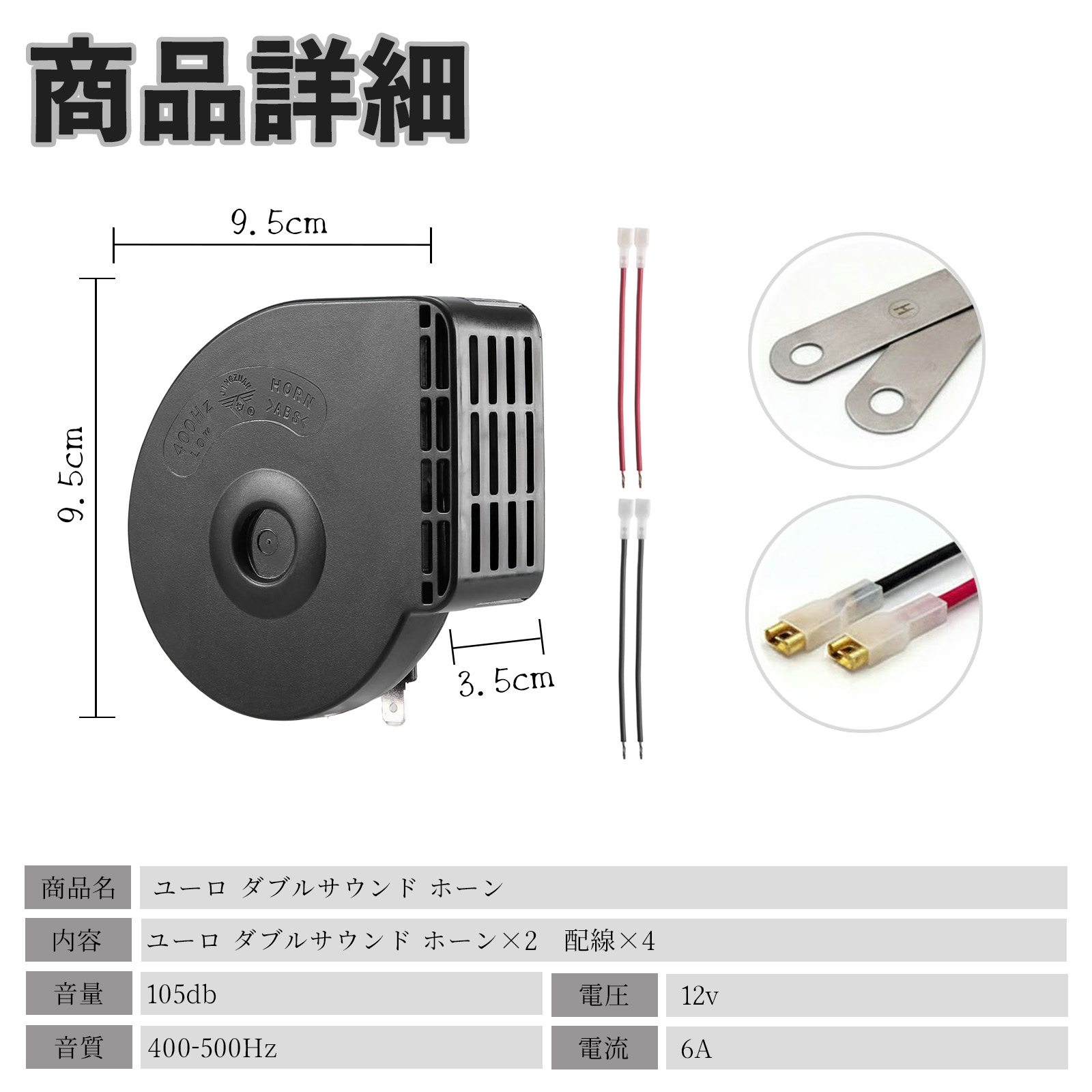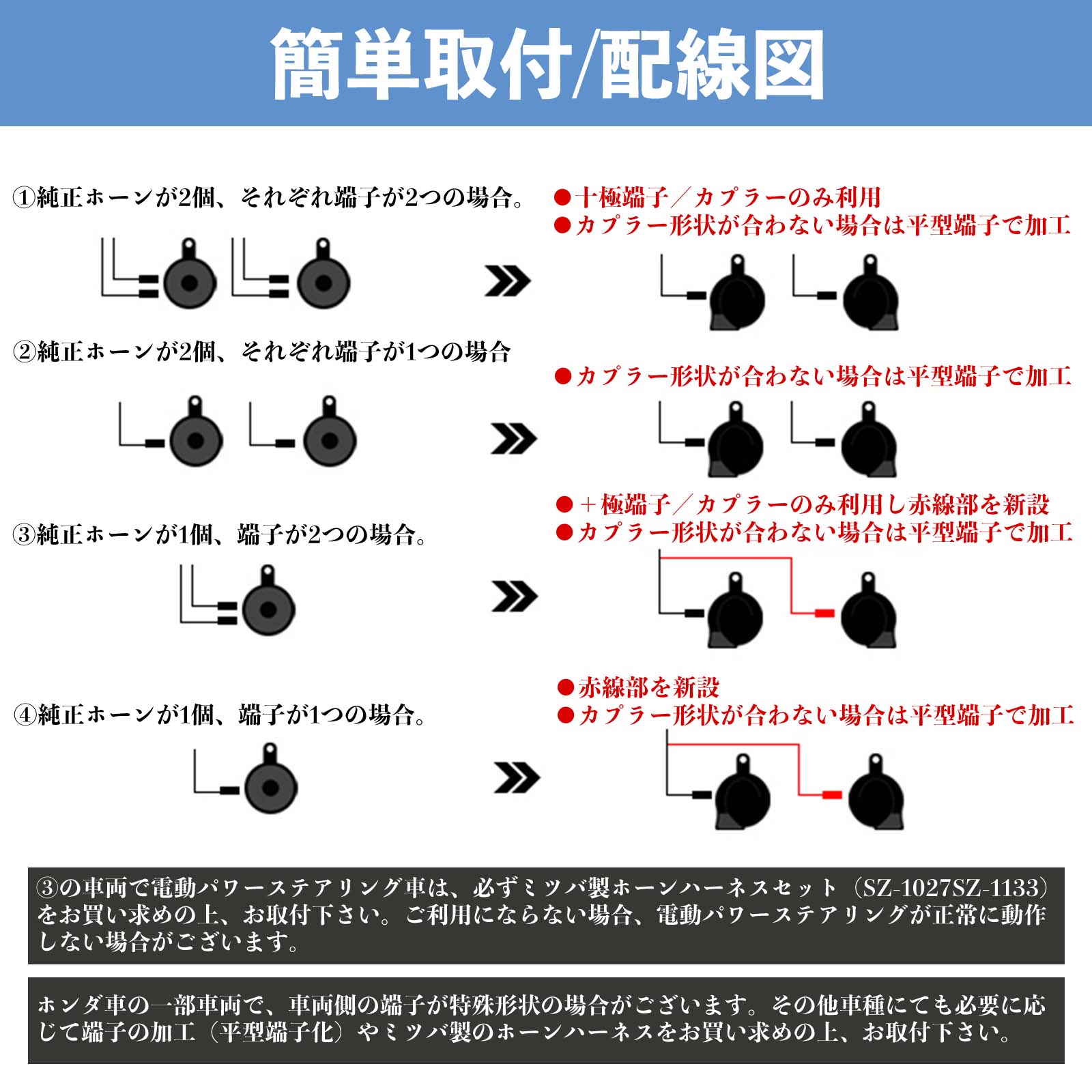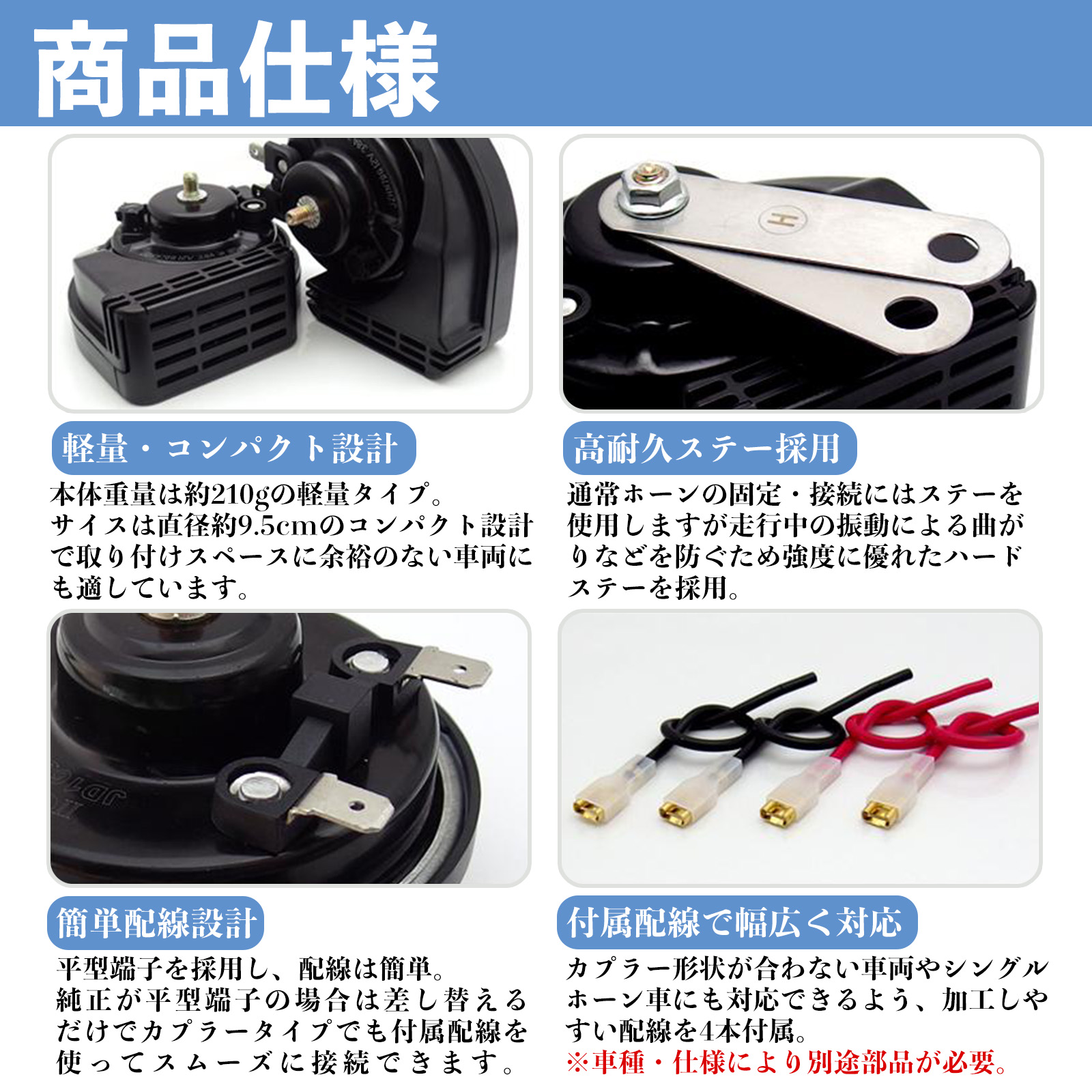 ※ 車種によってはホーン用ハーネス・リレー・平型端子等が別途必要となる場合があり、適合保証はございませんので事前にご確認ください。