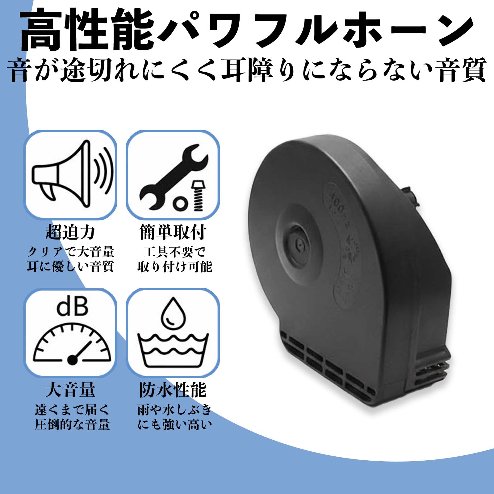 高音500Hz・低音400Hzのデュアルトーン設計。最大音量約105dBの明瞭で迫力あるサウンドにより、周囲へしっかりと注意喚起が可能です。