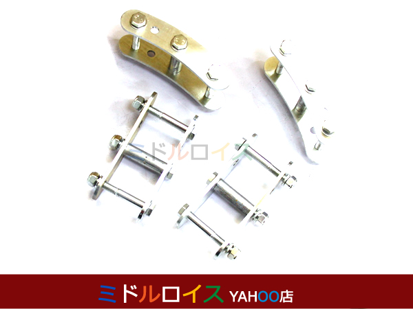 | シャックルにアールをつけてブーメラン形にしたので、ストローク量に応じてシャックルが最適な角度に動き リーフの動きを制限しません。 走行中の緩み止め防止するために、スプリングワッシャとセルフロック機構付のナットを用いているので安心です。 お安く提供するために、スチール製としましたが、三価クロメート処理を施しましたので、耐食性に優れ、また環境にも大変優しいです 約2インチアップします。 ノーマル状態からですとショック、ブレーキホースを変えることなくリフトアップできます。 スタビライザーを取り外す必要もありません。 ノーマル比40mmプラス、65mmプラスの2段階に調整可能です。 輸入商品です。純正同等のクオリティはございません。 小傷がある場合もございます。 |