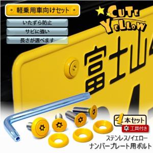 ナンバープレート用ボルト ピン・トルクスサラ ステンレス(イエロー) 4本 + 工具付セット