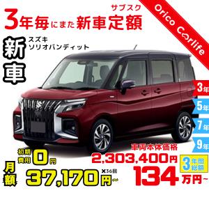 3年カーリース 新車 スズキ ソリオバンディット 月額37,170 円×36回 総額:1,338,120 円 車両価格2,303,400 円 3年後は返却・買取・延長自由に選べる
